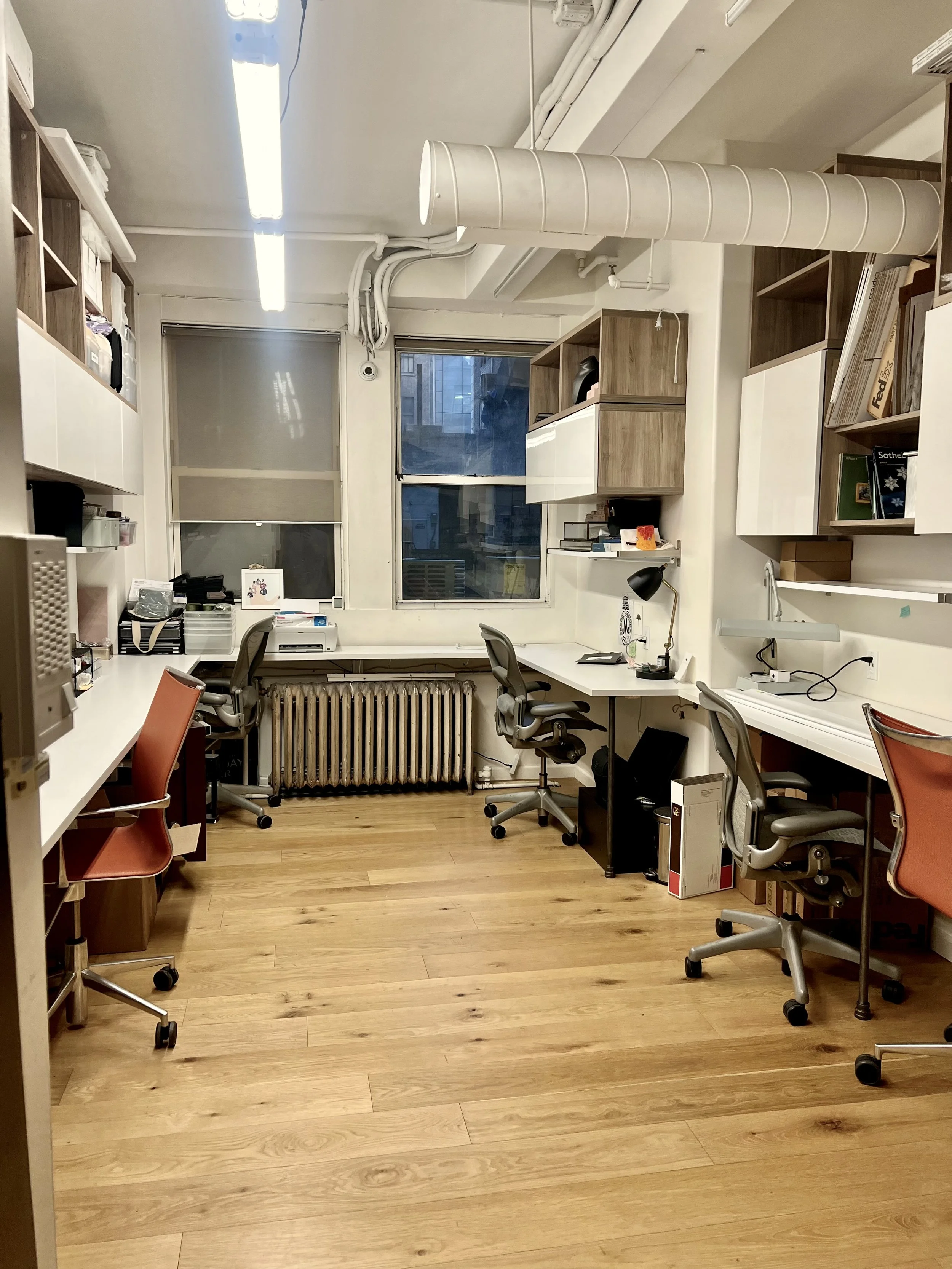Each desk comes with one shelf, two cabinets, and two-to-6 cubbies for ample storage space. Our designers usually use this space to house molds, tools, and packaging materials.